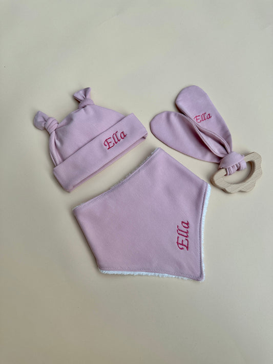 Personalised Hat, Bib & Teether Gift Set - Choose your fabric.