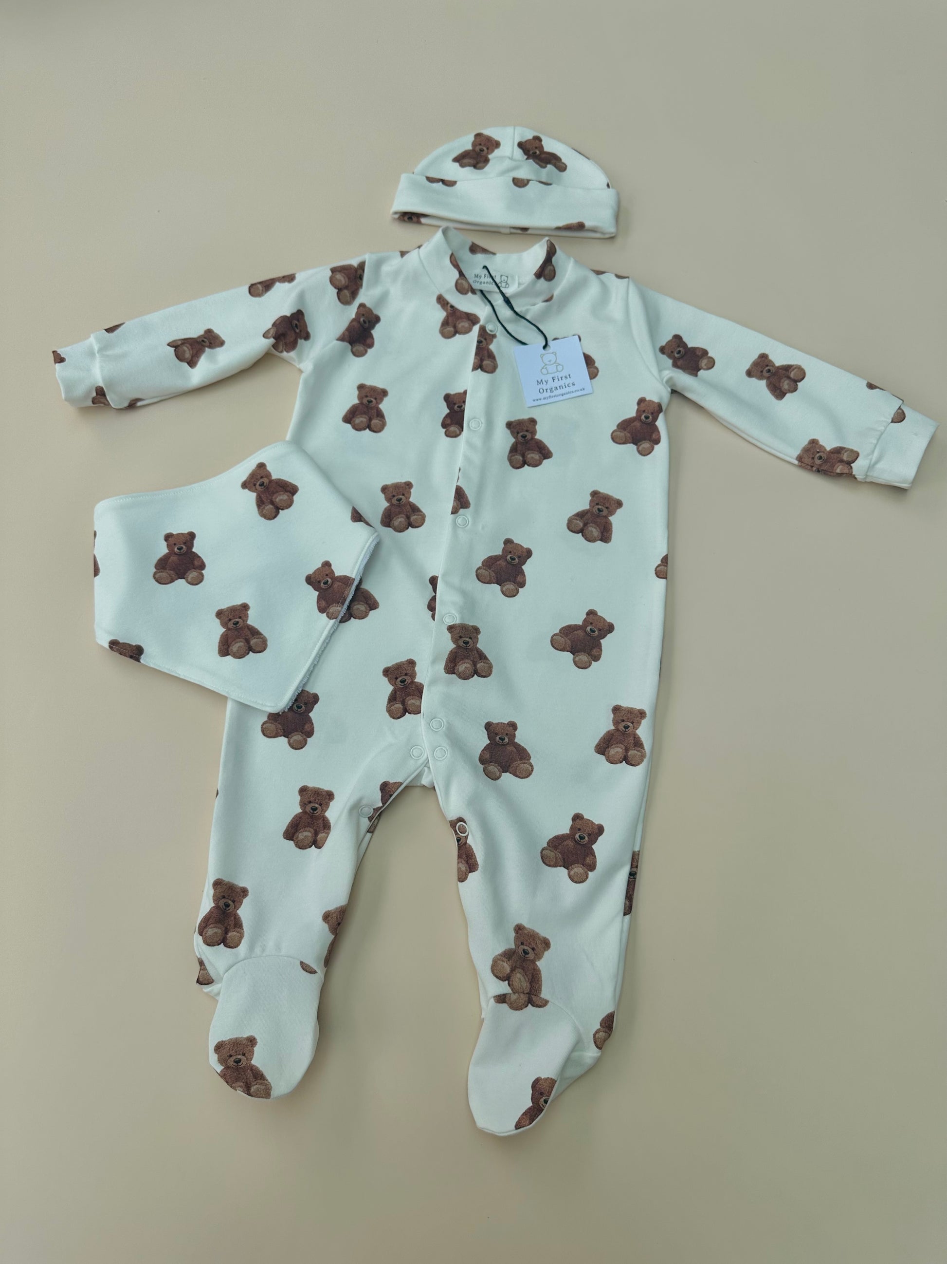Our classic organic babygrow with matching baby hat and bib is sustainably made in the UK using our organic fabric.